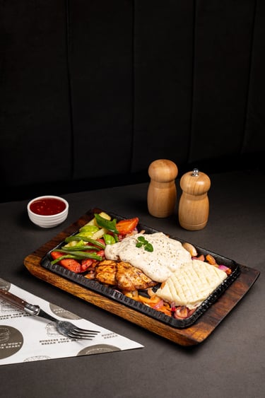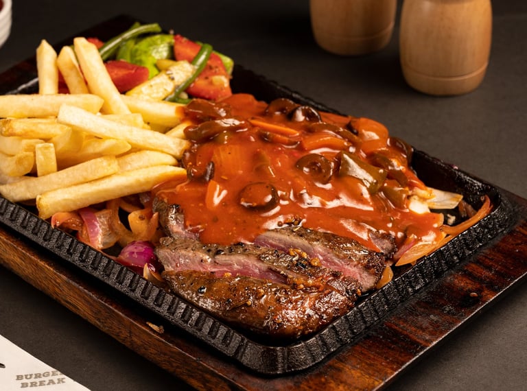 Enjoy a perfectly seared beef steak, cooked to your exact preference. Using a signature blend of spices that enhances the natural flavours of the meat, creating a truly unforgettable dining experience. To elevate the experience, it is served with a rich garlic butter that melts seamlessly over the warm steak, adding a delightful aroma and depth of flavour. Comes with your choice of a sauce and two sides.