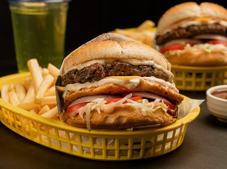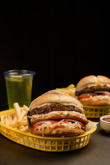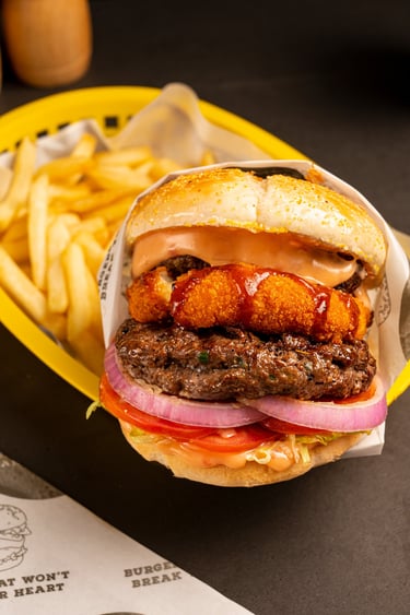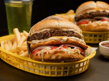 The ultimate duo burger, named the 10250, is a mouthwatering delight that combines the best of both worlds! This extraordinary creation features a juicy beef patty cooked to perfection, layered with a tender, savory chicken patty, offering a delightful contrast in flavors and textures.