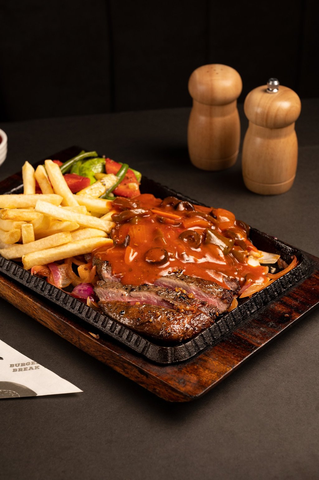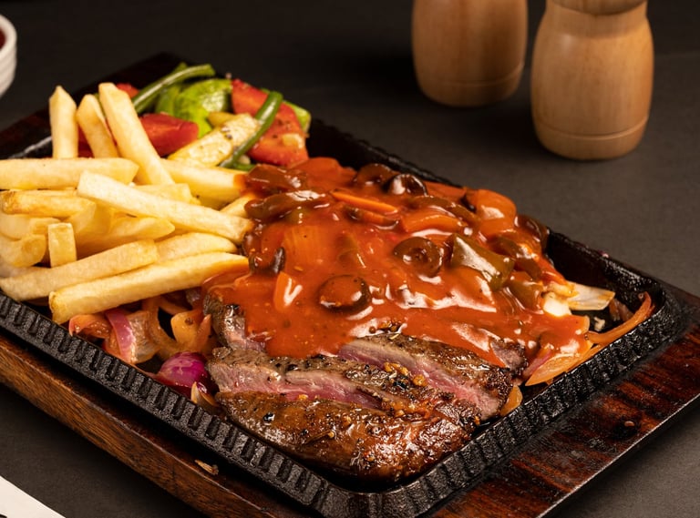 Enjoy a perfectly seared beef steak, cooked to your exact preference. Using a signature blend of spices that enhances the natural flavours of the meat, creating a truly unforgettable dining experience. To elevate the experience, it is served with a rich garlic butter that melts seamlessly over the warm steak, adding a delightful aroma and depth of flavour. Comes with your choice of a sauce and two sides.